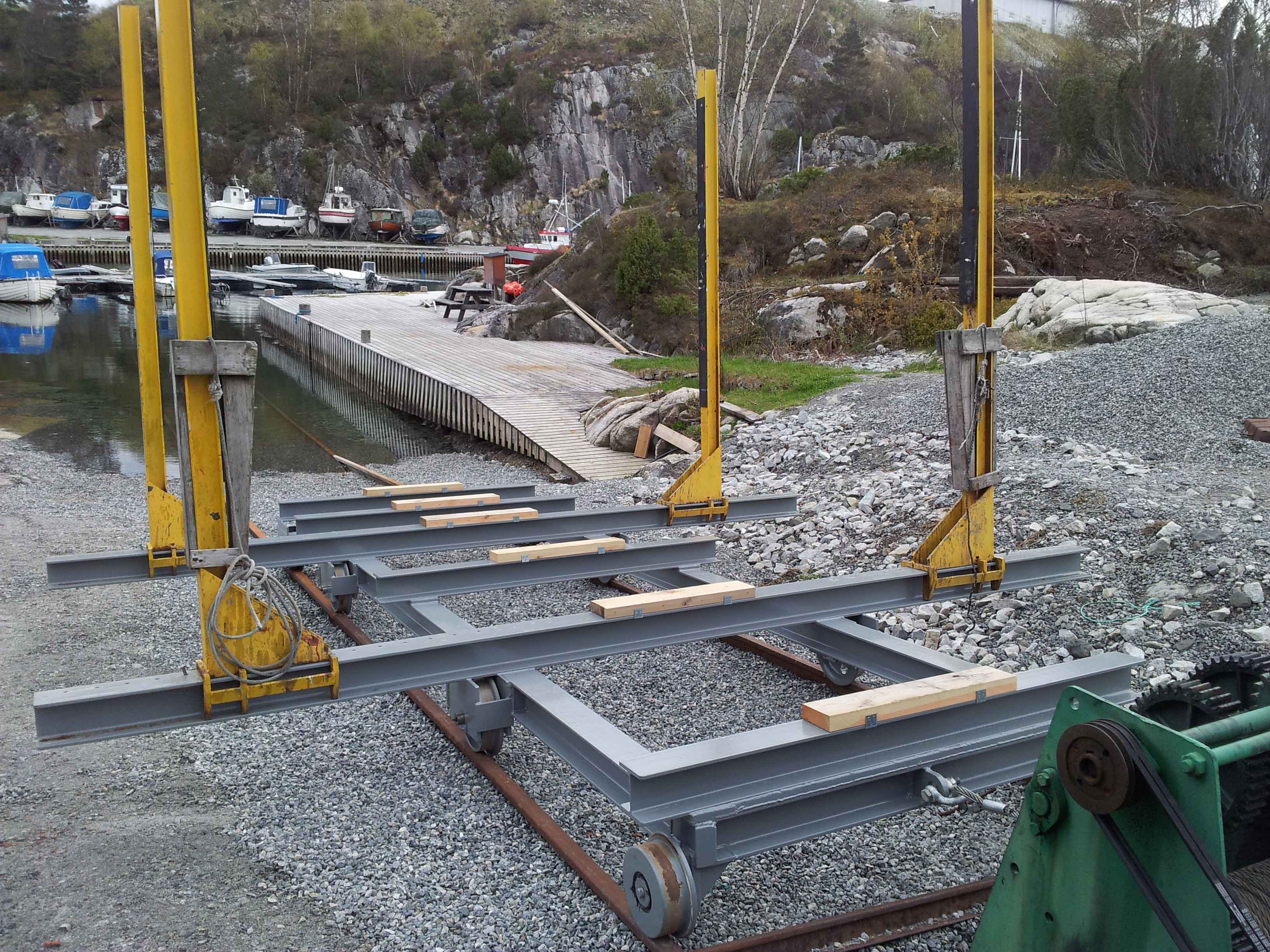 Etter iherdig dugnadsarbeid er den nye slippvogna på plass. Nå er vi er klar til å slippe båter opp til 40 fot. (Foto: Karl J. Risvold)